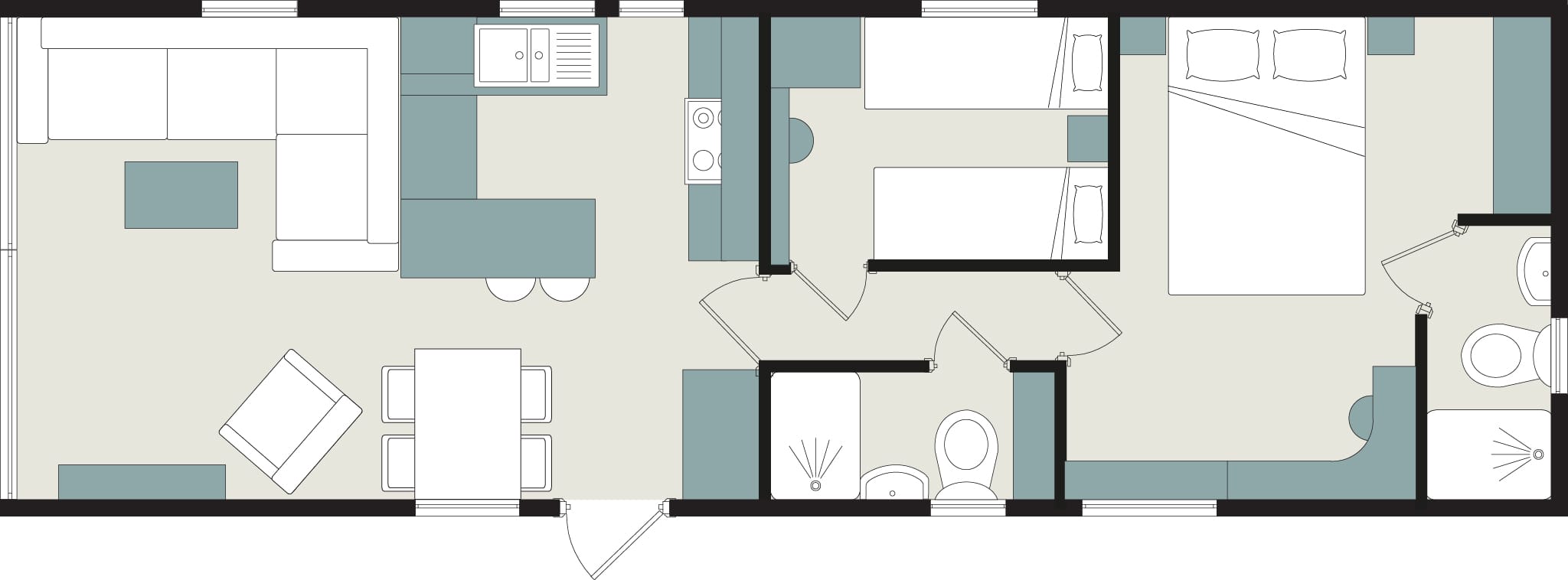 The double bedroom has a dressing table and ensuite bathroom with toilet and shower, whilst the twin room includes two single beds and wardrobes for storage.